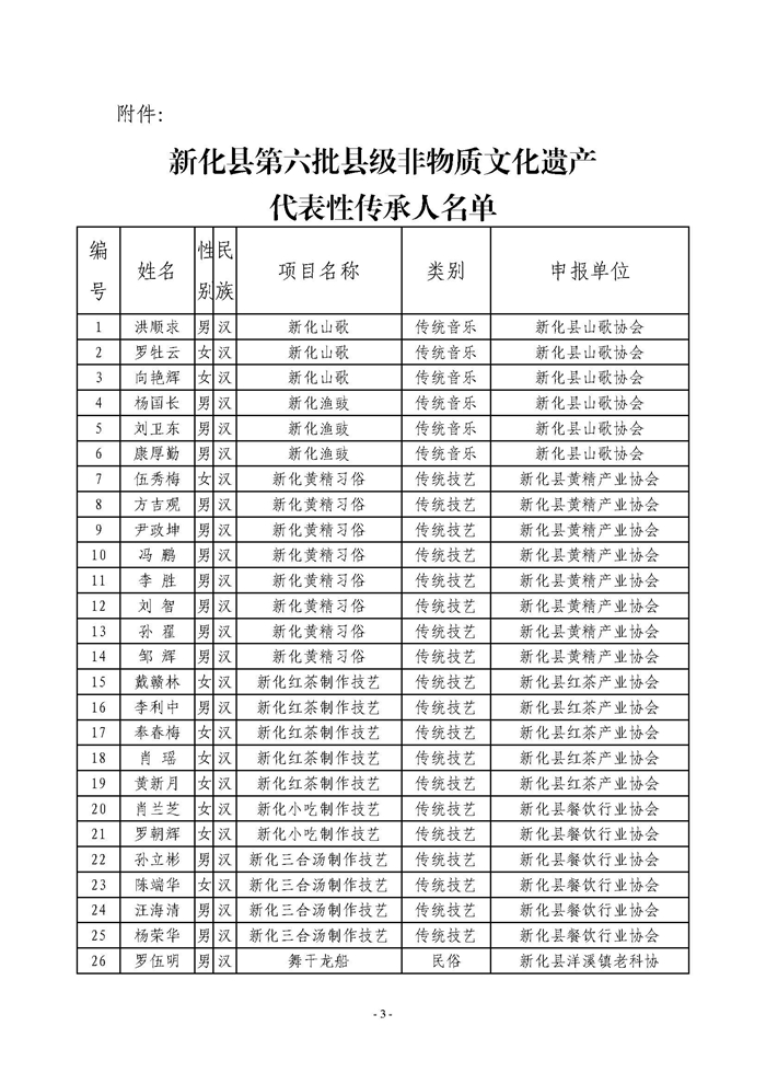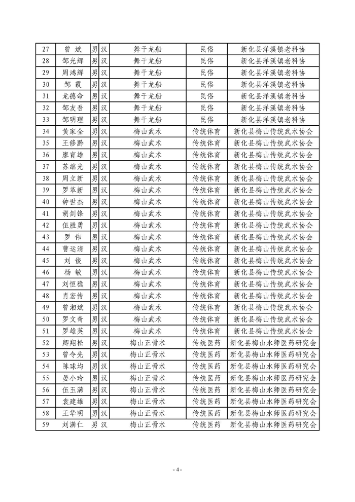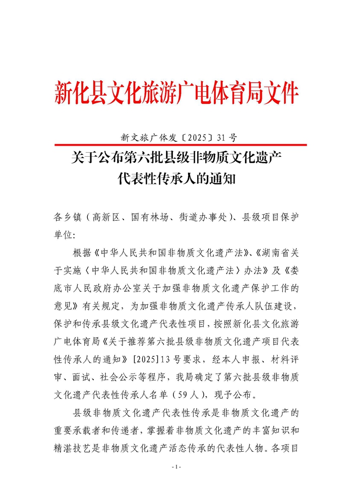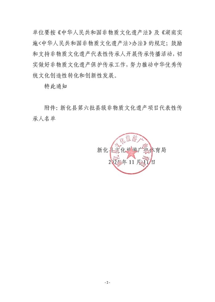 2025年11月,经相关程序,新化县文化旅游广电体育局确定了第六批县级非物质文化遗产代表性传承人59人,其中国家级非遗梅山武术代表性传承人18名。