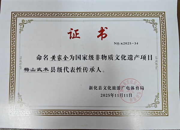 2025年11月,被认定为国家级非遗梅山武术县级传承人。