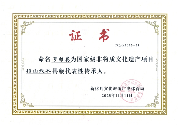 罗雄英,男,汉族,1973年出生,家住湖南新化西河镇东风村,家武大师传人。六岁开始习练祖传梅山武术,曾相继拜罗泽白、陈母亲等六位名师为师。精通梅山武术拳种和梅山武术器械刀、枪、剑、棍、板凳、铁尺、耙等近数十个套路,先后在贵州、甘肃、武汉、广州、淑浦等地开场教武。