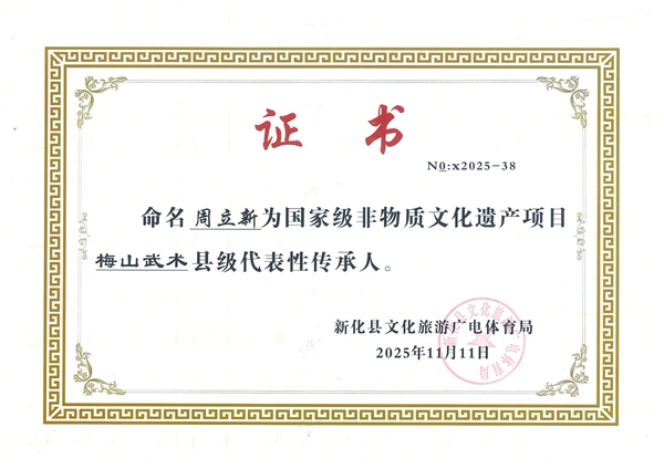 2025年11月,被认定为国家级非遗梅山武术县级传承人。